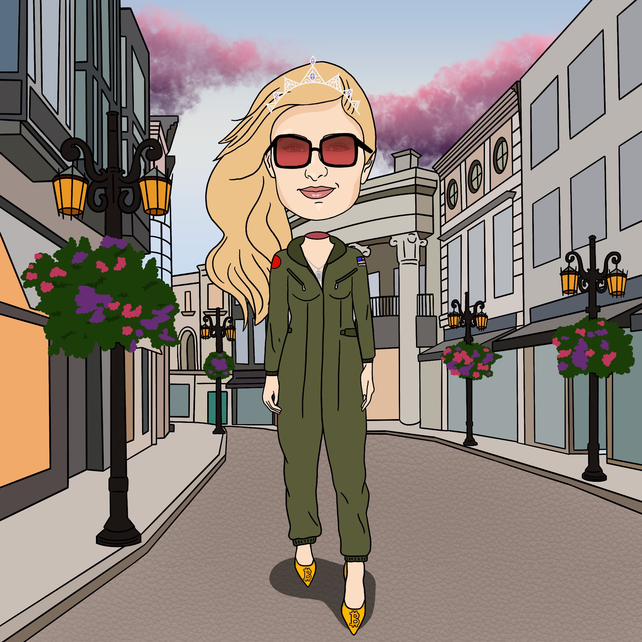 Paris on Rodeo Drive in a flight suit reflecting her grandfather Barron Hilton’s affinity for aviation. Her Ethereum bejeweled tiara sparkles above her shiney Bitcoin pumps.
