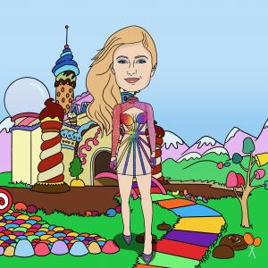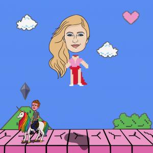 Paris hanging in an 8 bit meta world with a nod to the Ethereum blockchain and the Sandbox she is collaborating with while Vitalik Buterin rides a rainbow unicorn.