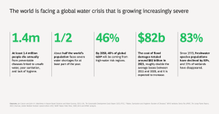 For more than a decade, water-related risks have led the World Economic Forum’s global risk assessment in terms of likelihood and severity of impact, on both people and businesses. The Intergovernmental Panel on Climate Change predicts that water-related risks will increase with every degree increase in global warming . The cost of flood damage was approximately $82 billion in 2021, nearly double the average losses recorded between 2011 and 2020, and is expected to rise in the years to come.